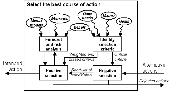 CriteriaSelection is done through the application of some form of criteria, which may be consciously or subconsciously selected. These are reasons for or against taking the action, which will allow us to weigh up the pros and cons or the return on investment for each alternative. Negative criteria, which give reasons not to select an alternative, may include costs, risks, difficulty, hassle and trouble. Positive criteria, which highlight the benefits that an alternative might offer, include whether goals will be met, how well they might be met, plus ease and speed of implementation. We tend to use many criteria based on deep needs and personality factors, for example extraverts may seek attention and risk whilst introverts will seek safety. Our values also lend key criteria that will help us decide what is right and wrong. Criteria may also be prioritized, for example cost may be all-important whilst time is a more negotiable element. Although we do not do mathematical weighting in our heads, we will usually lean towards some criteria rather than others. Negative selectionRemember when you last bought or rented a home. What you probably did was to go along to a number of housing agents and come away with piles of home details, then start your selection by sorting out the definite ‘no good,’ the ‘maybe’ and the ‘interesting’ homes. The initial strategy that we commonly use when faced with a lot of choices is to ‘sort the wheat from the chaff,’ rapidly eliminating those items we do not want, rather than looking closely at those which we might select. The negative criteria that we use clearly define the boundary of the problem in terms of our primary constraints. We reject houses because we definitely do not want to live in that area or cannot afford that amount of money. Forecasting and risk analysisA key technique for selecting the best course of action is to project the alternatives we are considering into the future to see what might happen if we implement each of these ideas. In forecasting we make much use of our mental models to help us grope forwards, weighing up the implications of each alternative, estimating both the possible outcomes and how likely each one is. We can then choose the most desirable future that will best move us towards achieving our goals. It is a testament to the power of human mind that we do this complex projection in the twinkling of an eye, whilst it still takes supercomputers many hours to calculate the weather. Positive selectionThe final selection of the alternative that we will implement uses criteria in a more positive way, seeking to narrow down the short-list to the item we will actually implement. This process is not always cool and rational, and even after a long and drawn-out selection process, we sometimes change our minds for no apparent purpose, probably because our subconscious either objects in some way to the selection or prefers another idea that has already been logically eliminated.