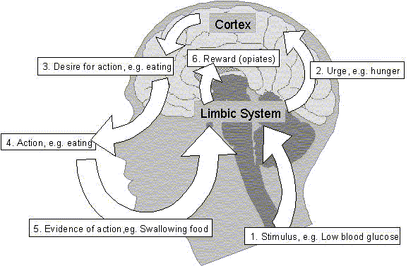 Six steps to heaven1. StimulusThe stimulus to the brain starts with a physical condition such as low blood sugar. It can also come from a visual signal from something desirable or undesirable, or even pure thought. In each case, the stimulus is a trigger for a sequence of internal events which will result in external action. 2. UrgeThe thalamus in the limbic system ('leopard brain') converts the physical need into an urge within the cortex. It is, in effect, saying 'Hey, do something! You have an unfulfilled need!' Cognitively-driven urges have a similar effect, where internal imaginings trigger an urge response. Urges are, quite literally, urgent. They have priority and force other matters aside. They are frequently felt as a kind of 'emptiness', typically felt physically as a gnawing feeling in the abdomen. For example the low blood-sugar gets translated in hunger. The lack of human company, especially close companionship, is a more instinctively driven situation that provides urge. Note how both give you a feeling of emptiness. 3. DesireThe cortex then translates this urge into a targeted desire for something specific, which gives us a conscious motivation towards a particular goal. The underlying urge becomes wants and needs. Wants and needs have to struggle against one another in a priority list for action now or later or not at all. The strength of the urge is thus important, with strong urges leading to needs that jump the queue, demanding immediate action. For example the felt urge of hunger is translated into a desire for food, whilst the urge for human company becomes a desire for company. This can be a desperate desire, as the starving person thinks of nothing but food and the love-struck individual cannot get the object of their desires out of their mind. 4. ActionEventually the urge-desire reaches its goal and the person takes physical steps to satisfy the internal nagging that has prodded them into action. The action may be small or it may take significant time and effort. It may also be undesirable in some way, such as when a person on a diet does not really want to eat. This only goes to show the power of this internal motivation system to force us into even uncomfortable action. 5. EvidenceTo complete the loop, the brain now needs proof that the action has been completed before it proceeds with its reward. It is not enough to remove the stimulus, for example intravenous feeding or going to a crowded place does not make you feel good. The evidence has to come in a particular place. It is specific actions which are rewarded. Going to a restaurant is not good enough. Looking at food is not good enough. Putting it in your mouth is in the right direction. You can almost hear the brain shouting 'go on, go on'. But it is the swallowing where you feel good. 6. RewardWhen the limbic system detects that we are satisfying the urge, like any motivation system it must reward to encourage continuance of the desirable behavior. The brain rewards us in two stages. The first stage is to tell us that we are doing the right thing and to encourage us to keep doing it. Thus we get to feel satisfaction for each mouthful of food. It's as if the brain is saying ‘That’s right! Keep doing that!’ However, we can't keep eating forever and there is a point at which our bodies have sufficient input to sustain them for a while. The job of the brain is now to stop us eating. It does this by making us feel fulfilled, often by a literal feeling of being 'full'. It is as if the brain says ‘Well done! That’s enough for now.’ The gnawing emptiness is now replaced by a replete sense of completion and satisfaction as we sit back and relax in an after dinner snooze. When the system goes astrayThis system does not always work to our advantage. If it breaks in some way, then we can either find ourselves stranded and unmotivated or stuck in a cycle of repetition. Can't startWhat if the cycle does not complete? The stimulation may be there, but somehow the chain of urge-desire-action has been broken. One way we are unable to start doing something we should is where urges clash, and one overcomes the other. In Anorexia Nervosa, the urge to be socially accepted and the consequent desire to be fashionably thin overrides the urge to eat. Cleverly, the part of the mind that wants to be thin compensates for the painfully thin reflection by hallucinating it into a fat and undesirable person. We can also break cycles merely by interruption. People who fast for political or religious reasons will tell you that once you have got past the day or so, it becomes increasingly easy to not eat, to the point where they have to force themselves to eat for some while before it becomes pleasurable again. Can't stopAs well as not being able start, we can also fall into a state where we cannot stop. The 'fulfillment' signal is either broken or is overridden by a stronger urge-desire signal. The reverse of Anorexia is over-eating. In this case, it is the system which tells us to stop which is broken. This may happen where the urge for comfort and to feel good drives us to do those things which have made us feel good in the past. Eating is thus driven less by the body's need for food as the brain's need for comfort. Obsessive-Compulsive Disorder (OCD) is a classic syndrome where non-helpful urges fall into a can't stop cycle. These can include peculiar 'can't stop' activities, from counting and repetitive movements to collecting and other actions that others find annoying or trivial. So what?So this is the inner secret of how the brain prods us into action. You can use this system to change behaviors. Breaking the cycleTo stop someone over-eating, you could provide something more desirable. When they reach for the food, show them a picture of a healthy person. You can also do the reverse, showing them a picture of a fat person. You could put a mirror on the refrigerator. You can also break cycles by removing stimuli. So take 
