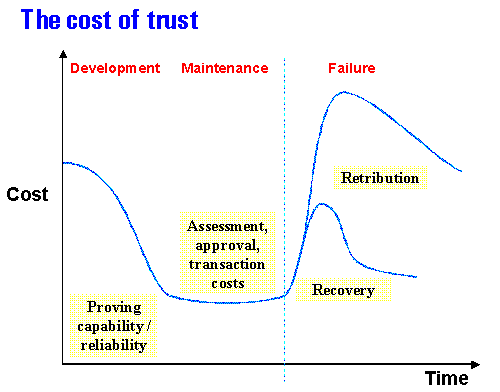 Like quality, trust costs. I can either pay up-front to assure it, or I can cross my fingers and end up paying a potentially much higher price down the line. The greater the distrust, the higher the price in terms of building and assurance, let alone any failure costs. Cost of developing trustIt takes time to build trust. We may start by researching the other person’s background, perhaps by asking other people or scanning their resumé. We can always watch them at work, interacting with other people as well as ourselves. And we can check their actions over time. Cost of maintaining trustOn an ongoing basis, how do you stay confident that you can trust what they are doing? This often takes the form of formal measurement, reviews, approvals and so on, effectively looking over their shoulder to double-check that they are doing what you want them to do. When they offer advice or make recommendations, trust assurance may include getting a second opinion or utilizing further evaluation methods. Each interaction thus has a transaction cost, which includes the cost of getting to the person with whom you will interact, along with the cost of assuring trust. A significant reason why companies exist is to reduce that transaction cost. If I am a sole trader, I need to first find customers and suppliers and then decide whether I can trust them. It’s a better economic proposition to form a working group where access is faster and trust levels can be build up beforehand, such that in each transaction we can both quickly get down to business. Cost of trust failureWhen trust is broken, work not only may need to be redone but there may be other, far more serious knock-on effects. A single trust failure can have a knock-on impact other trust relationships, such as when a person you have trusted to do some work for a customer has failed in some way, resulting in the customer’s trust in the whole company and brand being affected. Trust failure can also lead to retribution and revenge, where the betrayed person seeks compensation beyond that which may be considered as fair. They have been emotionally hurt and want to exact a penalty that emotionally hurts you in return. If they had given you a high level of trust and feel very strongly about the betrayal, then their actions may be very damaging. Revenge actions can also cause counter-reactions, where the avenged-upon also feels emotionally wronged and seeks revenge for the revenge. In this way, simmering feuds and outright battles can erupt, with the accompanying fall-out that can suck many others into the fray.